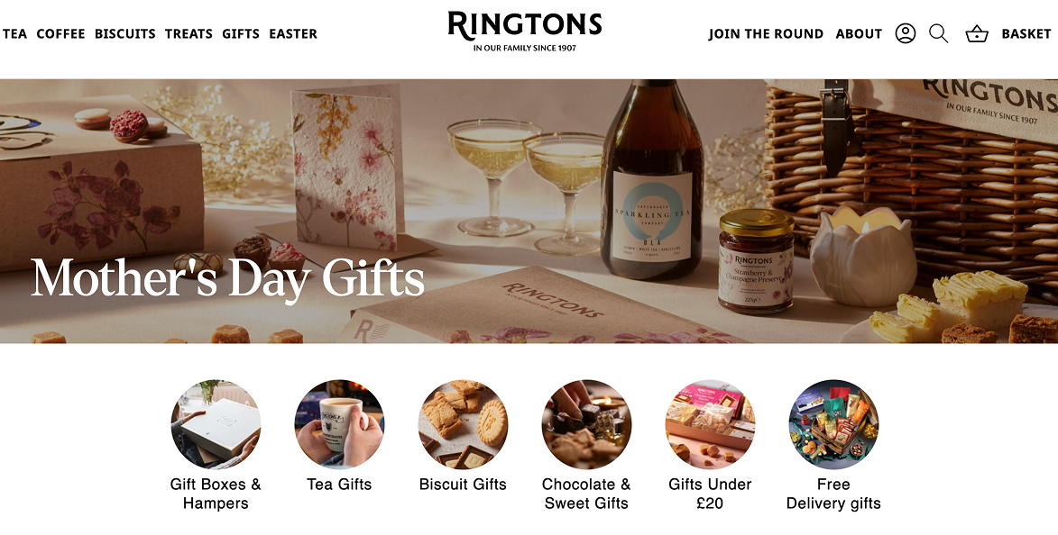 From a UX perspective, it’s a huge win. Customers don’t have to manually dig through your site to find products, they have everything they need in one place. Organize your page into clear, shoppable sections like gift guides, “gifts under $50”, last-minute buys, personalized options, bundles, bestsellers, and self-care picks. A good example of this is Ringdon’s dedicated Mother’s Day landing page…