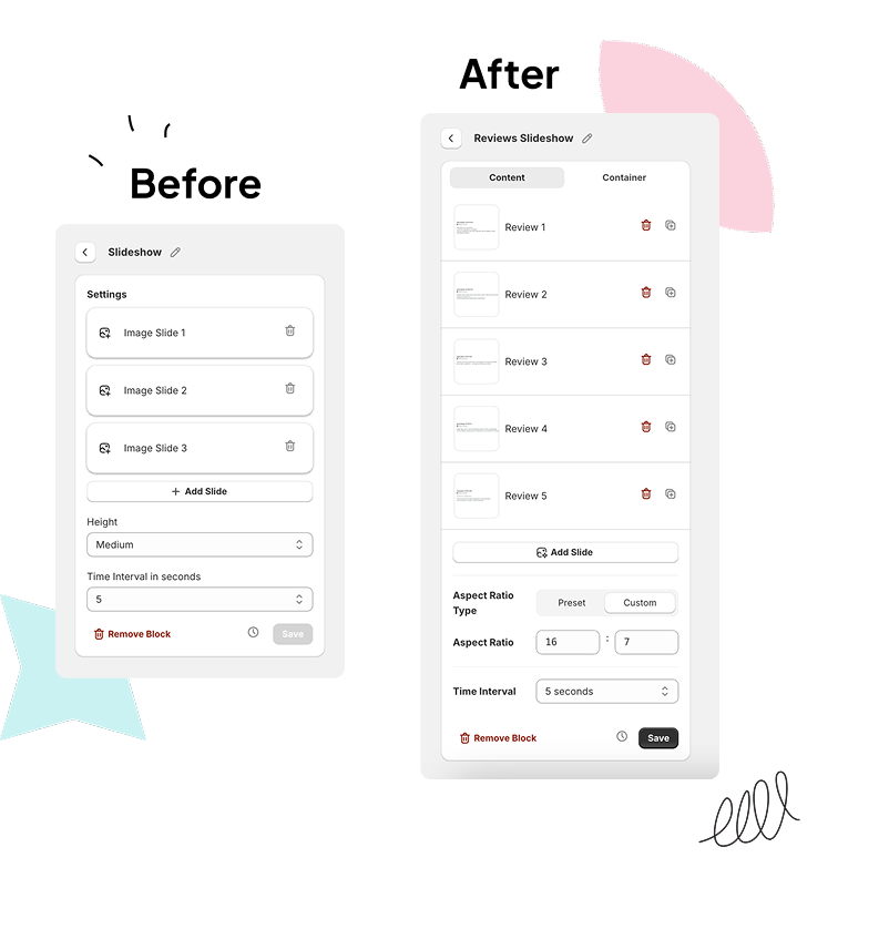 With this upgrade, each slide can now have its own actions, plus rich text, buttons, and full styling options, just like our enhanced Image with Text block. You can tweak colors, adjust spacing, format text, and even control the timing of each slide. All of this gives you far more control over both how your slideshow looks and how it performs.